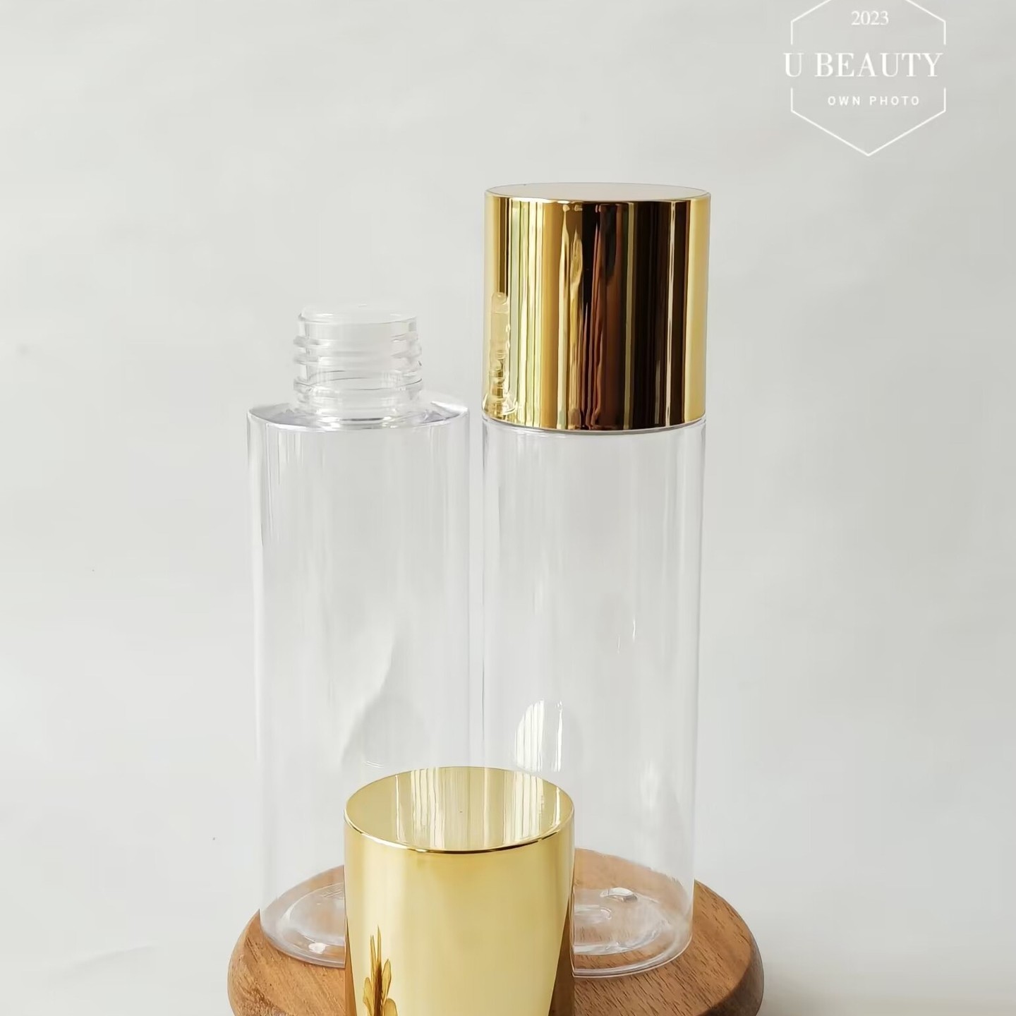 **透明瓶,带亮金色盖子;