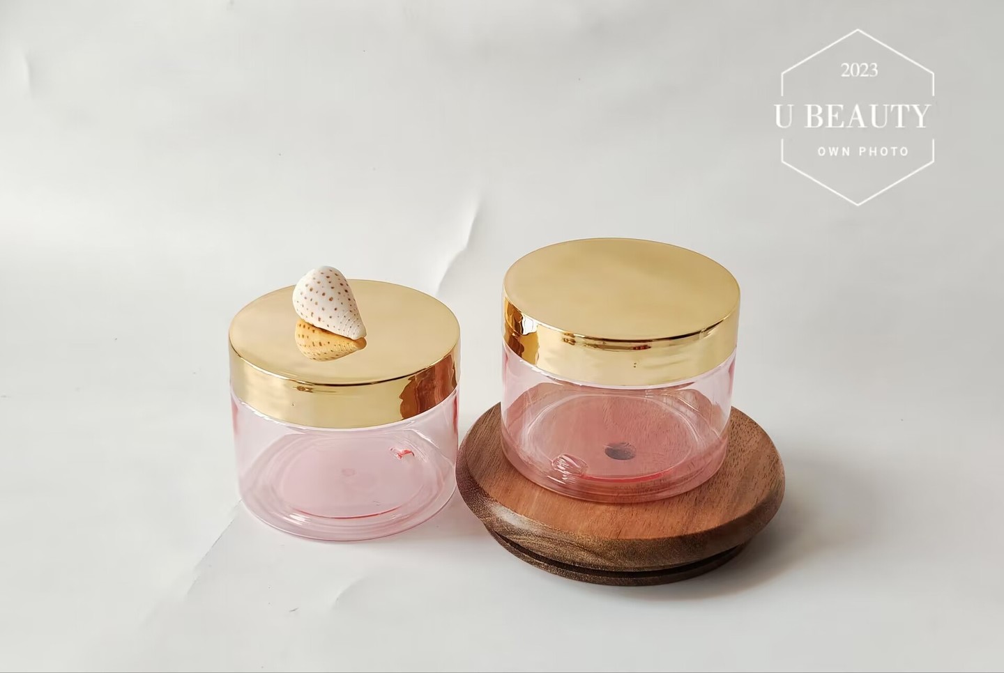 **透明的粉红色罐子,盖子是亮金色的;
