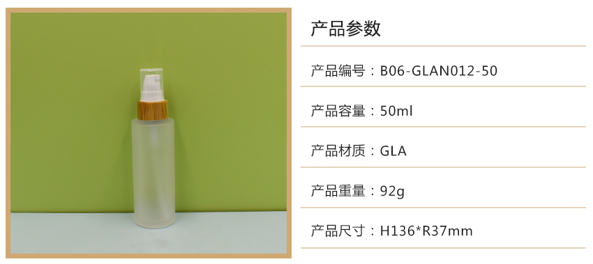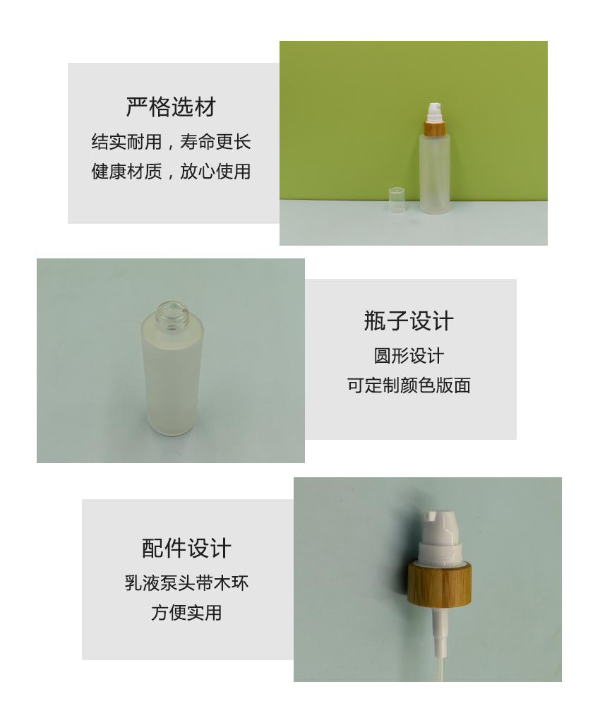 产品亮点:圆形设计,磨砂表面,乳液泵头带木环